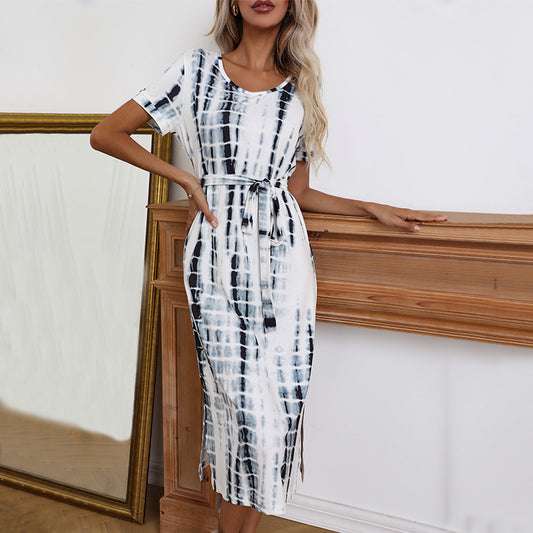 Summer Style Slit Short Sleeve Tie-Dye Print Dress