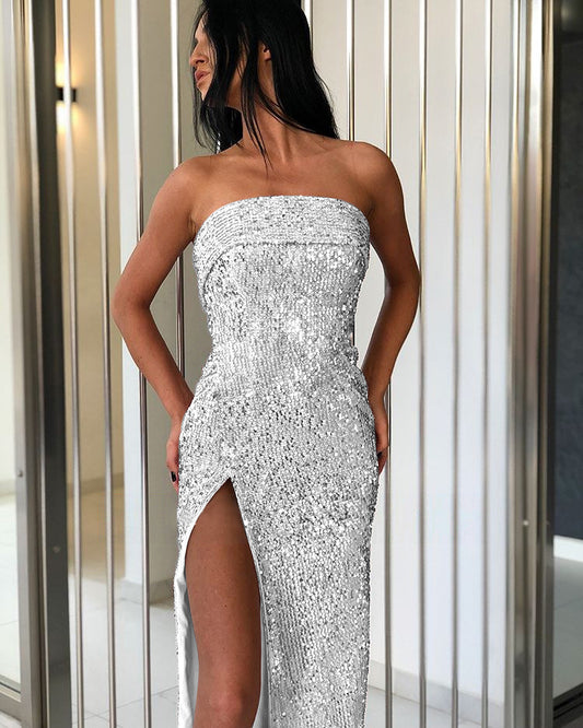 Sexy Strapless Stretch Tube Top Sequin Silver Front Slit Long Dress