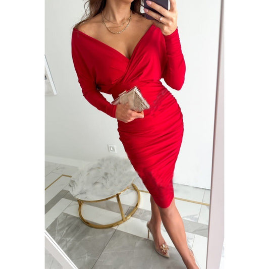 Off Shoulder V-neck Long Sleeve Ruched Midi Dress