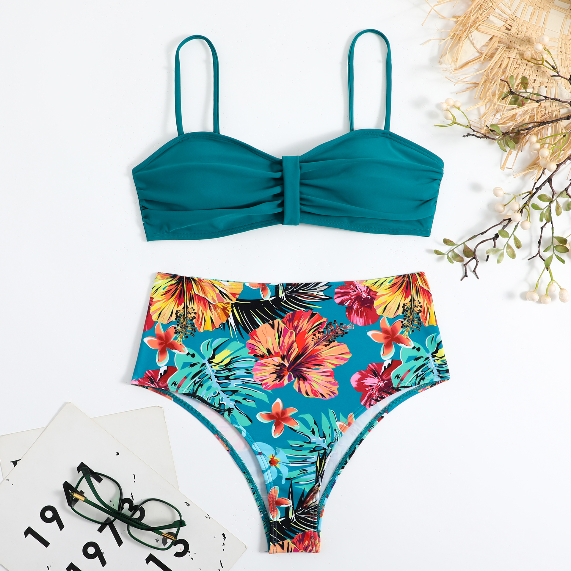 Sweet Tropical High Waisted & Ruched Front Padded Bra Top Bikini